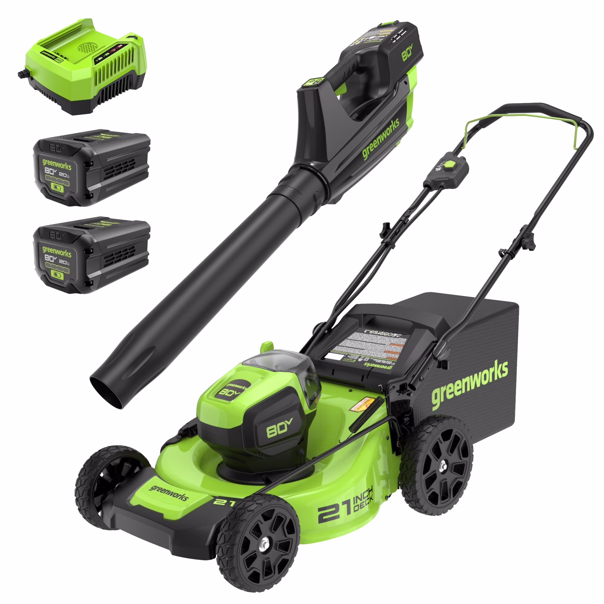 Greenworks 80V 21" Brushless Push Cordless Electric Lawn Mower + 500 CFM Axial Leaf Blower, With Two 2.0Ah Batteries and 30 Minute Rapid Charger
