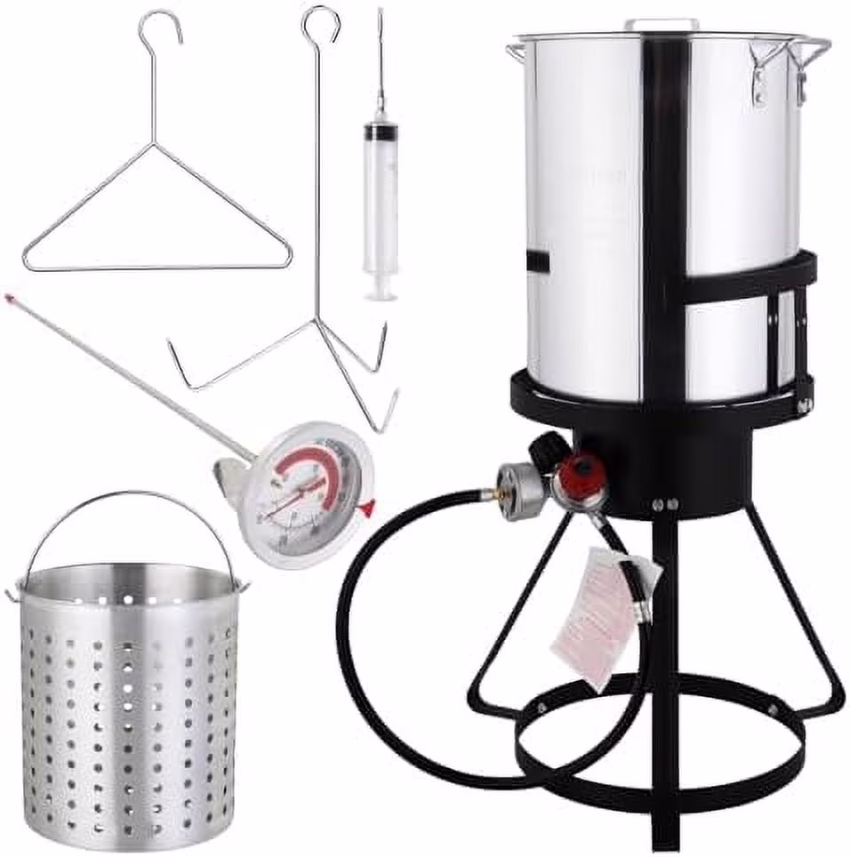 2024 New 30 Qt Turkey & 10 Qt Fish Fryer Boiler Steamer Set, Aluminum Turkey Deep Fryer Pot, 38, 000 BTU Outdoor Propane Stove Stand for 20 Lbs Turkey, Thermometer, Turkey Rack & Lifting Hook
